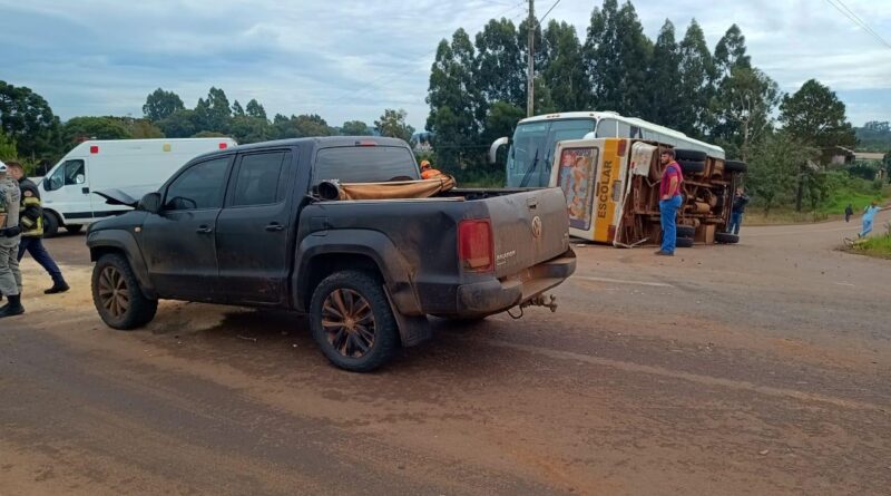 Micro-ônibus com estudantes da APAE tomba após choque com camionete na RS 211 em Erechim