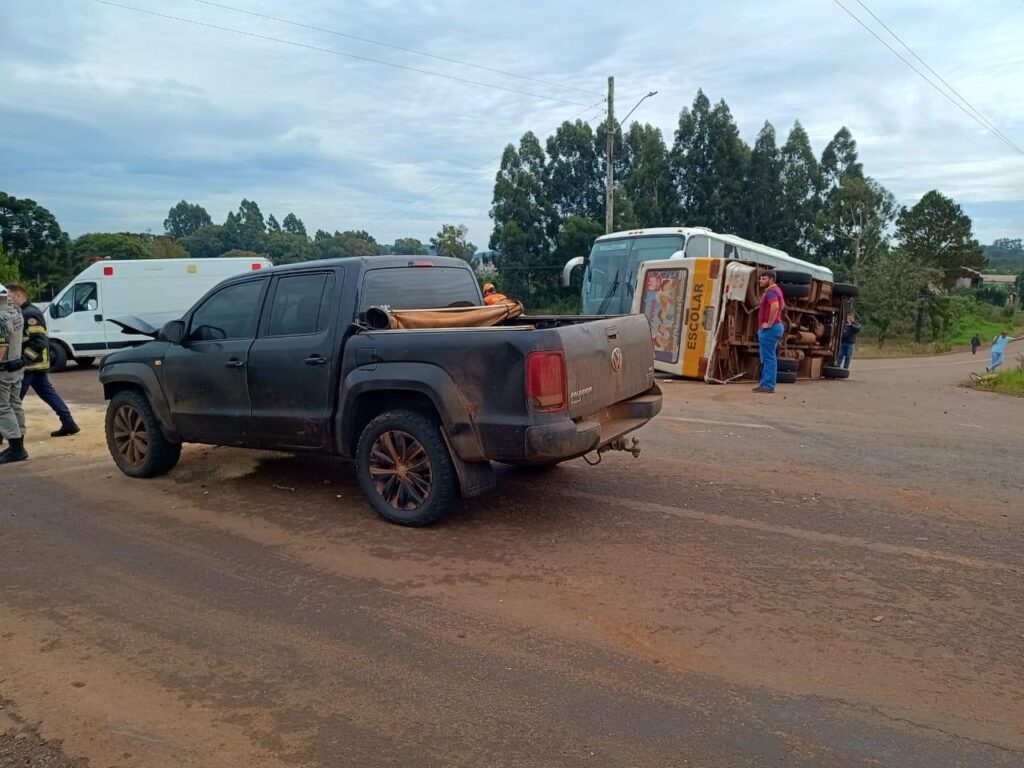 Um micro-ônibus que transportava alunos da APAE tombou no acesso da RS 211 ao Bairro Agrícola, depois de colidir com uma camionete, no fim da amanhã desta sexta-feira, 05, em Erechim.
