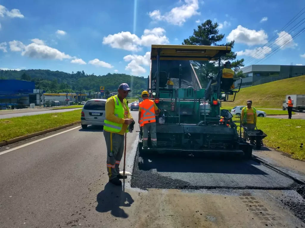 A presença de trabalhadores e máquinas pode ocasionar redução de velocidade, retenção de veículos, trechos em meia pista e tráfego intercalado.