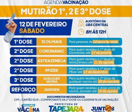 A Secretaria de Saúde de Tapejara promove neste sábado (12), o mutirão de vacinação para aplicação da primeira, segunda ou terceira dose/reforço da vacina contra a Covid-19 de acordo com o cronograma descrito na imagem.