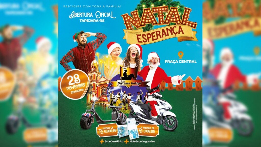 O sorteio acontece no dia 30 de dezembro na Praça Central e show com a Banda Accústica. A realização da Campanha Natal Esperança Premiado 2021 é Prefeitura de Tapejara em parceria com a Acisat, Expo Tapejara e Câmara de Vereadores.