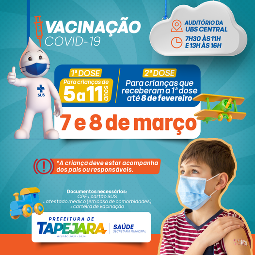 A Secretaria de Saúde de Tapejara promove nesta segunda-feira (07) e na terça-feira (08), a aplicação da primeira dose da vacina contra a Covid-19 em crianças de 05 a 11 anos. Também haverá aplicação da segunda dose em crianças que receberam a primeira dose de CoronaVac até 08/02.
