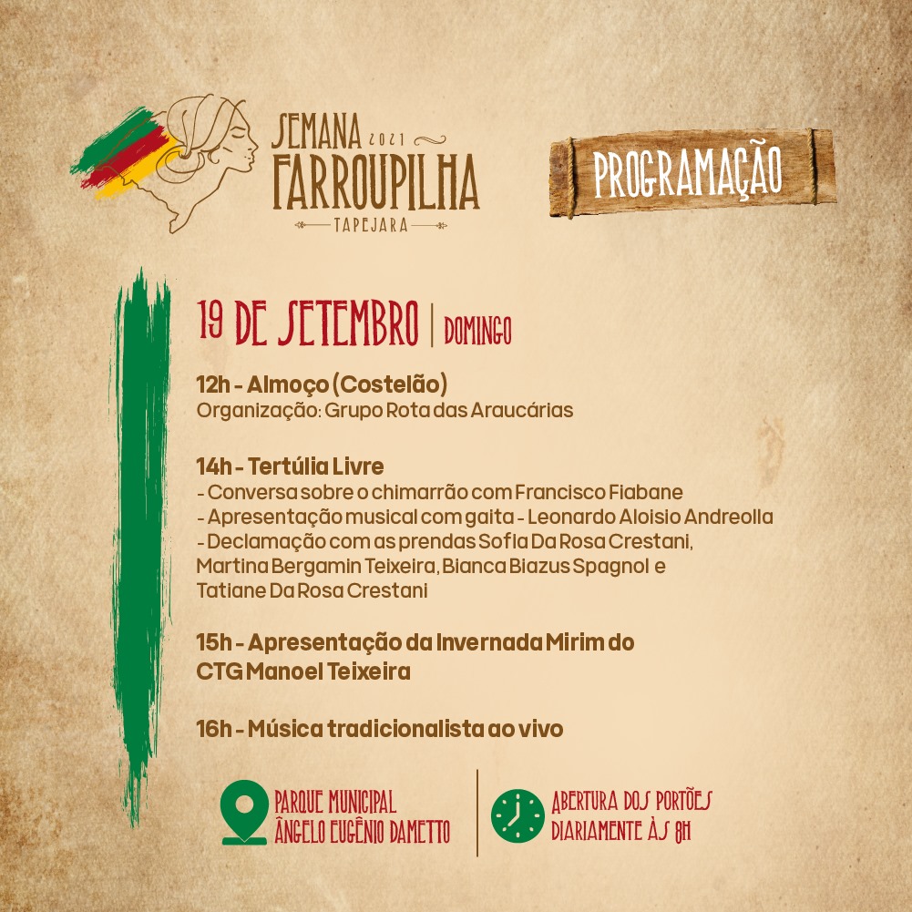 Dando sequência na Programação Farroupilha em Tapejara, neste domingo, 19 de setembro, as atividades tem sequência no Parque Municipal Ângelo Eugênio Dametto.