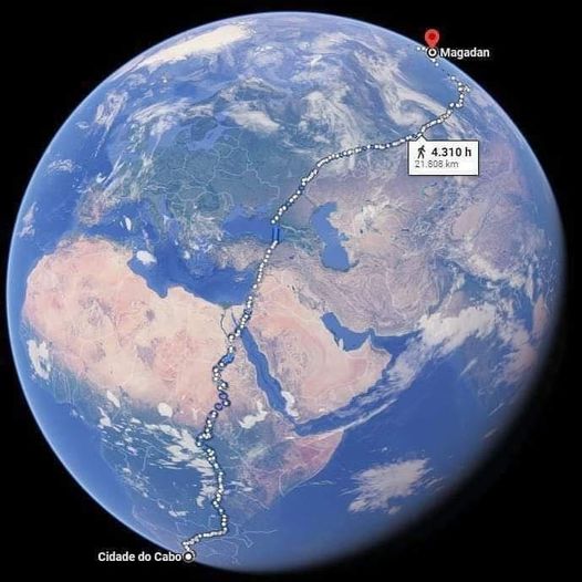 O caminho mais longo do mundo a pé sem a necessidade de atravessar o oceando ou qualquer outra barreira significativa é da Cidade do Cabo (África do Sul) a Magadan (Rússia).