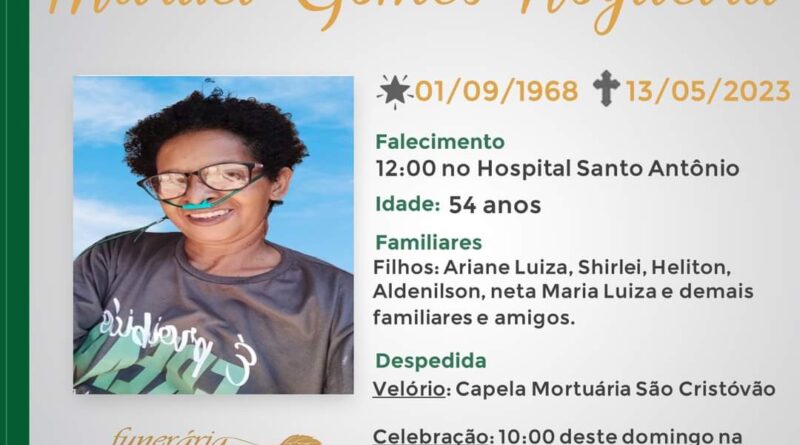 A Funerária São Cristóvão, juntamente com a família Nogueira, comunica com pesar, o falecimento de Marilei Gomes Nogueira, ocorrido às 12 horas do dia 13/05/2023 no HSA com 54 anos de idade. Seu corpo está sendo velado na Capela da Funerária São Cristóvão. Celebração às 10 horas do dia 14/05/2023 e após seu sepultamento no Cemitério Municipal João Rombaldi.