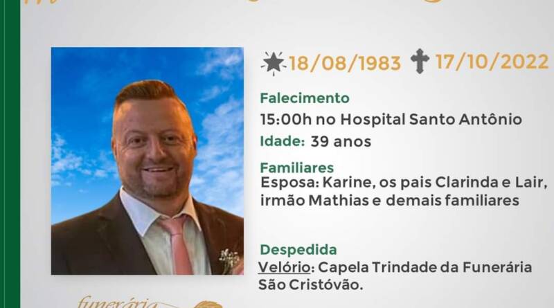 A Funerária São Cristóvão, juntamente com a família Trindade comunica com pesar, o falecimento de Matheus da Trindade “Batata”, ocorrido às 15:00 horas do dia 17/10 no HSA com 39 anos de idade. Seu corpo está sendo velado na Capela Trindade da Funerária São Cristóvão. Celebração às 10:00 horas do dia 18/10 e após seu sepultamento no Cemitério Municipal de Ibiaçá.