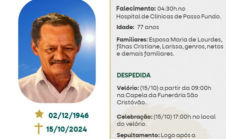 A Funerária São Cristóvão, juntamente com a família de Souza, comunica com pesar, o falecimento de Adão Lourenço de Souza, ocorrido às 04h30 do dia 15/10/2024 no Hospital de Clínicas de Passo Fundo com 77 anos de idade. Seu corpo está sendo velado na Capela da Funerária São Cristóvão. Celebração às 17 horas do dia 15/10/2024 e após seu sepultamento no Cemitério Municipal João Rombaldi de Tapejara.
