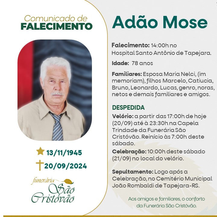 A Funerária São Cristóvão, juntamente com a família Mose, comunica com pesar, o falecimento de Adão Mose, ocorrido às 14 horas do dia 20/09/2024 no HSA de Tapejara com 78 anos de idade. Seu corpo está sendo velado na Capela Trindade da Funerária São Cristóvão. Celebração às 10 horas do dia 21/09/2024 e após seu sepultamento no Cemitério Municipal João Rombaldi.