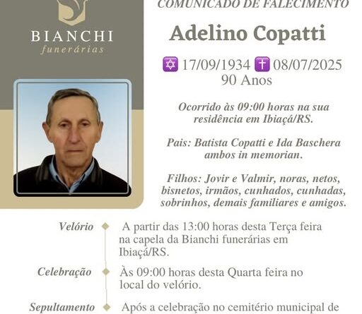A Bianchi Funerárias, juntamente com a família Copatti, comunica com pesar, o falecimento de Adelino Copatti, oorrido às 9 horas do dia 08/07/2025 em sua residência em Ibiaçá com 90 anos de idade. Seu corpo será velado a partir das 13 horas, na Capela da Bianchi Funerárias de Ibiaçá. Celebração às 09 horas do dia 09/06/2025 e após seu sepultamento no Cemitério Municipal de Ibiaçá.