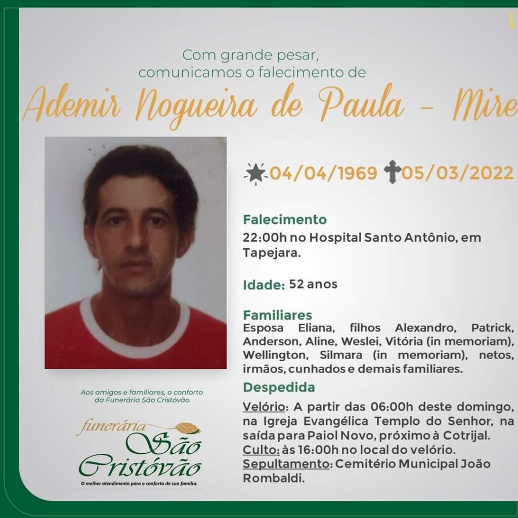 A Funerária São Cristóvão, juntamente com as famílias Nogueira e de Paula, comunicam com pesar, o falecimento de Ademir Nogueira de Paula, ocorrido às 22:00 horas do dia 05 de março no HSA com 52 anos de idade. Seu corpo será guardado, a partir das 06:00 horas de domingo (06/03), na Igreja Templo do Senhor na saída para Paiol Novo. Às 16:00 horas haverá culto no local e após seu sepultamento no Cemitério Municipal João Rombaldi.