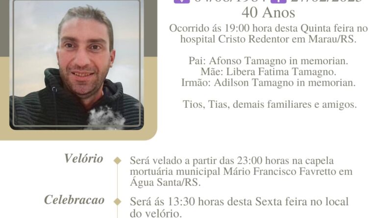 A Bianchi Funerárias, juntamente com a família Tamagno, comunica com pesar, o falecimento de Adenilson Tamagno, ocorrido às 19 horas do dia 27/02/2025 no Hospital Cristo Redentor de Marau com 40 anos de idade. Seu corpo está sendo velado na Capela Mortuária de Água Santa. Celebração às 13h30 do dia 28/02/2025 e após seu sepultamento no Cemitério Municipal João Rombaldi.