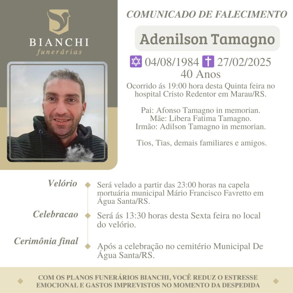 A Bianchi Funerárias, juntamente com a família Tamagno, comunica com pesar, o falecimento de Adenilson Tamagno, ocorrido às 19 horas do dia 27/02/2025 no Hospital Cristo Redentor de Marau com 40 anos de idade. Seu corpo está sendo velado na Capela Mortuária de Água Santa. Celebração às 13h30 do dia 28/02/2025 e após seu sepultamento no Cemitério Municipal João Rombaldi.