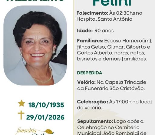 A Funerária São Cristóvão, juntamente coma família Felini, comunica com pesar, o falecimento de Alaide Felini, ocorrido às 02h30 do dia 29/01/2026 no HSA de Tapejara, com 90 anos de idade. Seu corpo está sendo velado na Capela Trindade da Funerária São Cristóvão. Celebração às 17 horas do dia 29/01/2026 e após seu sepultamento no Cemitério Municipal João Rombaldi.