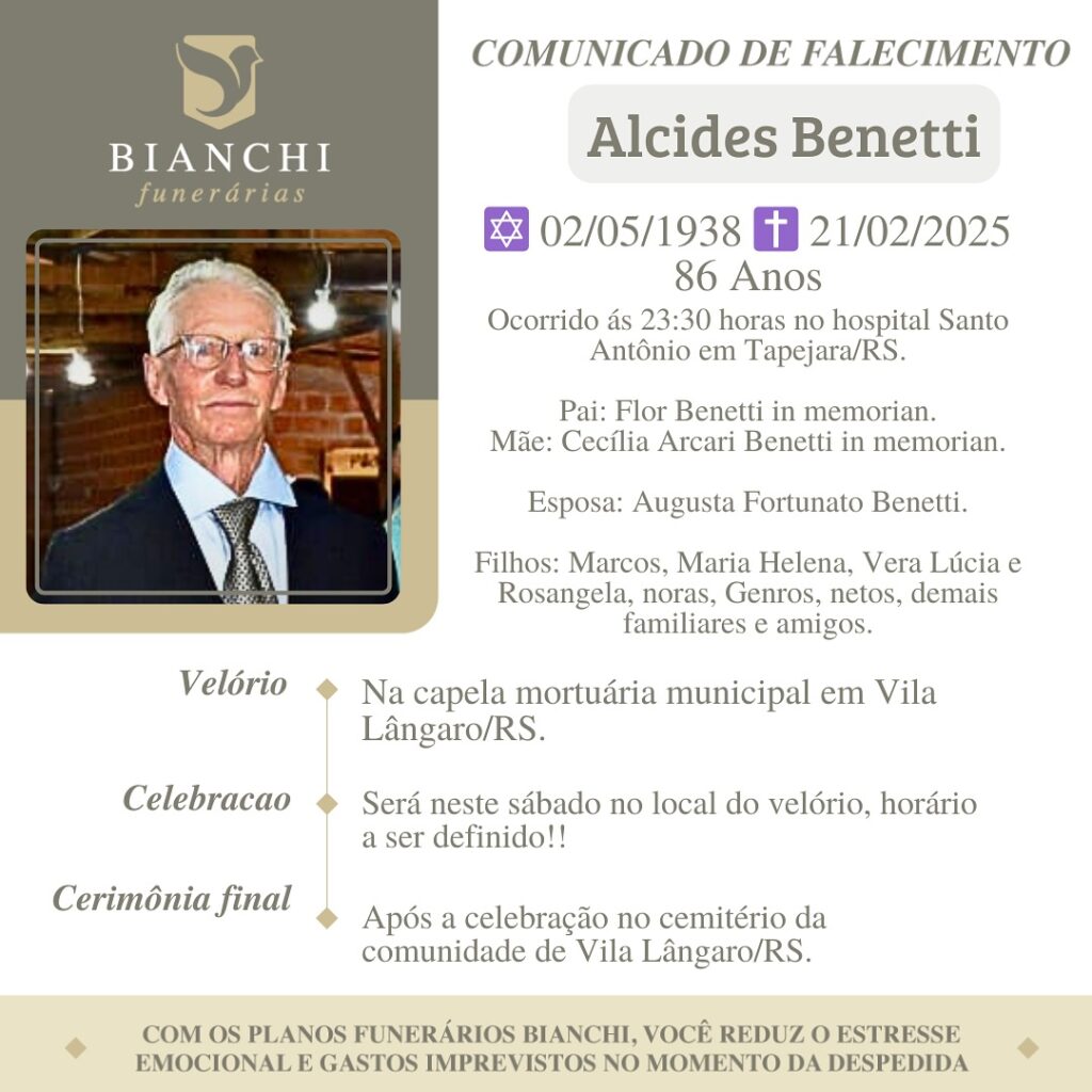 A Bianchi Funerárias, juntamente com a família Benetti, comunica com pesar, o falecimento de Alcides Benetti, ocorrido às 23h30 do dia 21/02/2025 no HSA de Tapejara com 86 anos de idade. Seu corpo está sendo velado na Capela Mortuária de Vila Lângaro. Celebração neste sábado com horário a ser definido e após seu sepultamento no Cemitério Municipal de Vila Lângaro.