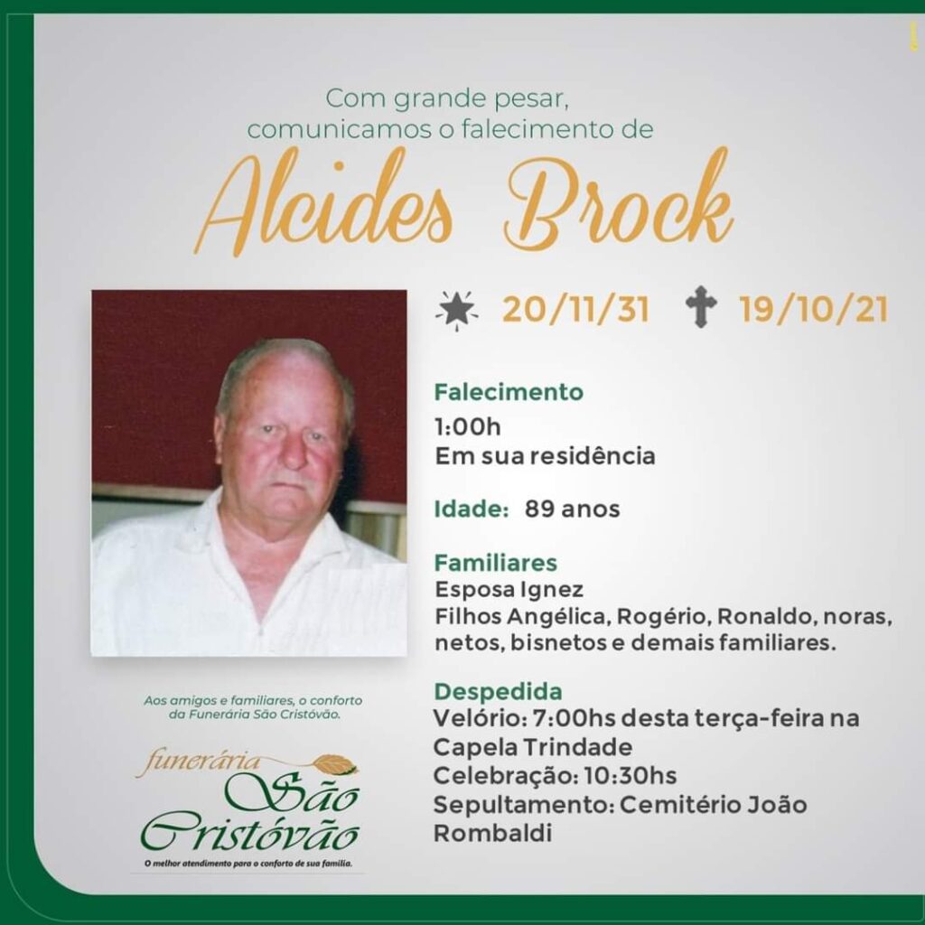 A Funerária São Crisóvão, juntamente com a família Brock, comunica com pesar, o falecimento do senhor Alcides Brock, ocorrido em sua residência à 1:00 hora desta terça feira (19/10) com 89 anos de idade. Seu Alcides deixa a esposa Ignez, os filhos Angélica, Rogério, Ronaldo, noras, netos, bisnetos e demais familiares.