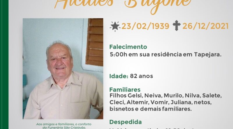 A Funerária São Cristóvão, juntamente com a família Bugone, comunicam com pesar, o falecimento do senhor Alcides Bogone, com 82 anos de idade, ocorrido as 05:00 horas de domingo (26/12) em sua residência. Seu corpo será velado a partir das 12:30 horas de hoje na Capela Trindade da Funerária São Cristóvão. As 17:00 horas haverá celebração e após seu sepultamento no Cemitério Municipal João Rombaldi.