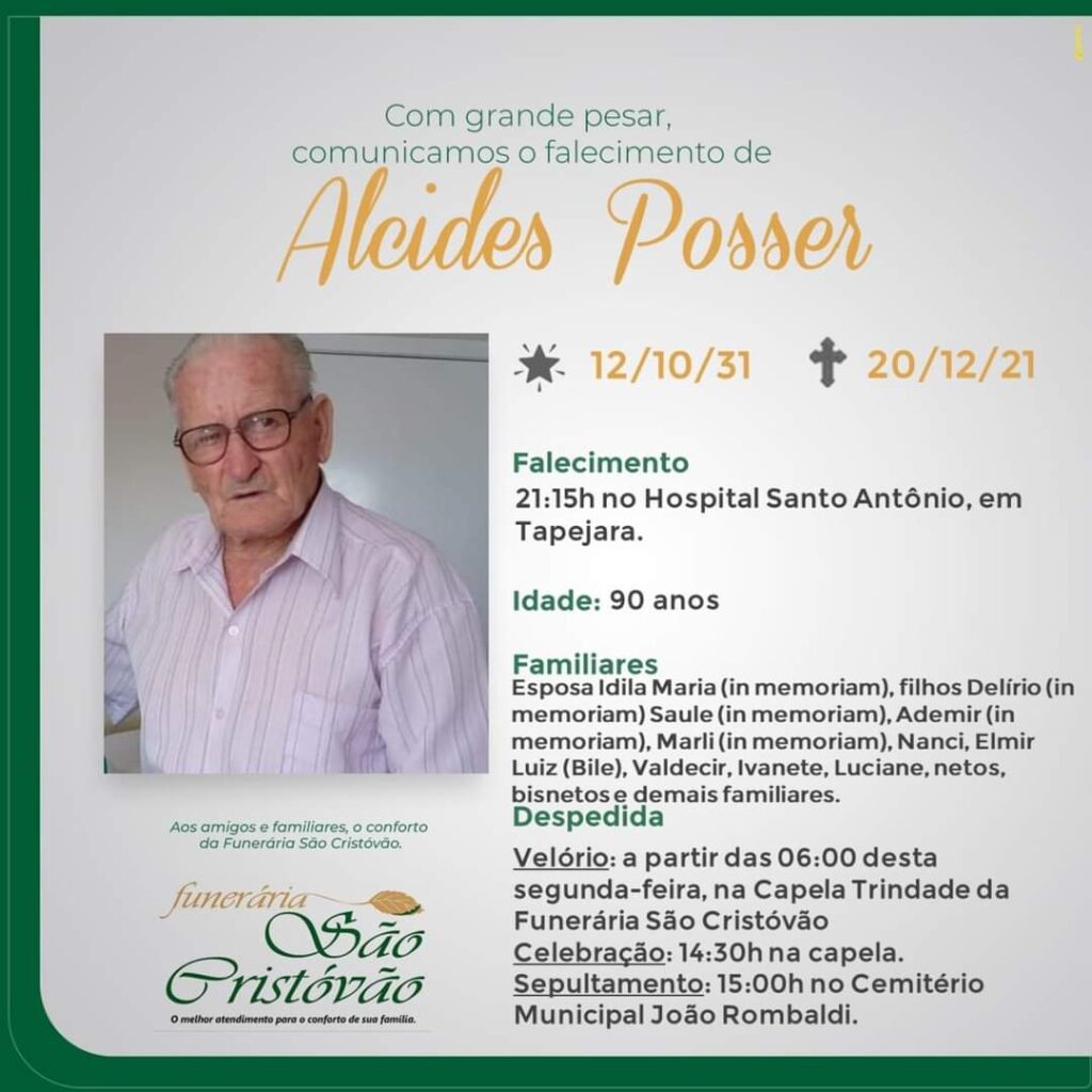 A Funerária São Cristóvão, juntamente com a familia Posser, comunica com pesar, o falecimento do senhor Alcides Posser, com 90 anos de idade, ocorrido as 21:15 horas de domingo (19/12) no HSA. Seu corpo será velado a partir das 06:00 horas de segunda-feira (20/12), na Capela Trindade da Funerária São Cristóvão. As 14:30 celebração e após seu sepultamento no cemitério municipal João Rombaldi.