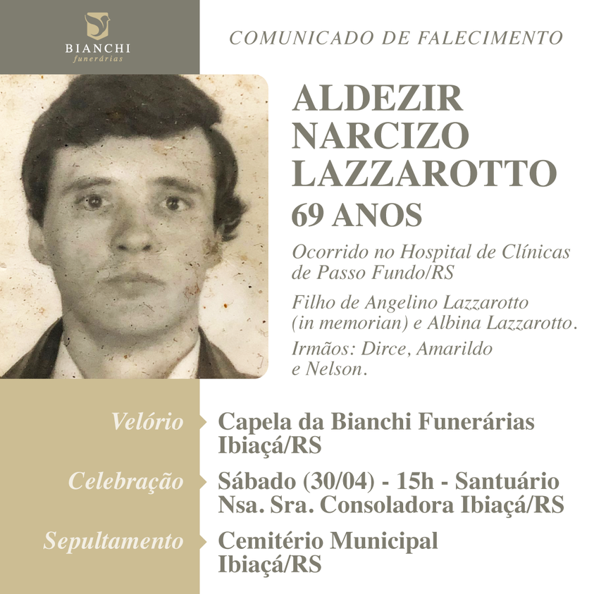 Bianchi Funerárias, juntamente com a família Lazzaroto, comunica com pesar, o falecimento do senhor Aldezir Narcizo Lazzaroto, com 69 anos de idade, ocorrido sábado (30/04/2022), no Hospital de Clínicas de Passo Fundo/RS. Seu corpo está sendo velado na Capela da Bianchi Funerárias de Ibiaçá. às 15:00 horas celebração no Santuário Nossa Senhora Consoladora e após seu sepultamento no Cemitério Municipal de Ibiaçá.