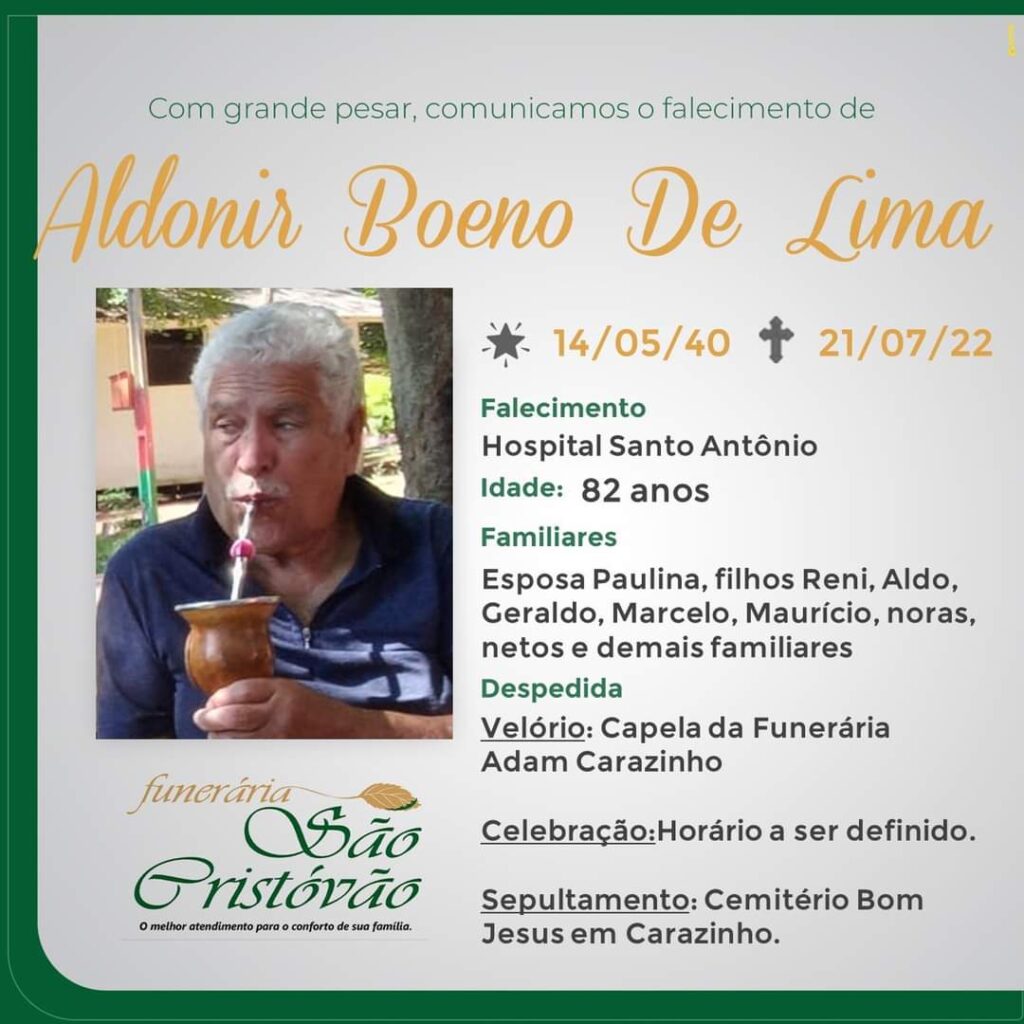 A Funerária São Cristóvão, juntamente com a família de Lima, comunica com pesar, o falecimento do senhor Aldonir Boeno de Lima, ocorrido dia 21/07 no HSA com 82 anos de idade. Seu corpo está sendo velado na Capela da Funerária Adam de Carazinho. Atos de despedida a ser definido.