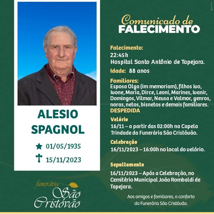 A Funerária São Cristóvão, juntamente com a família Spagnol, comunica com pesar, o falecimento de Alesio Spagnol, ocorrido às 22h45 do dia 15/11/2023 no HSA com 88 anos de idade. Seu corpo está sendo velado na Capela Trindade da Funerária São Cristóvão. Celebração às 16 horas do dia 16/11/2023 e após seu sepultamento no Cemitério Municipal João Rombaldi.