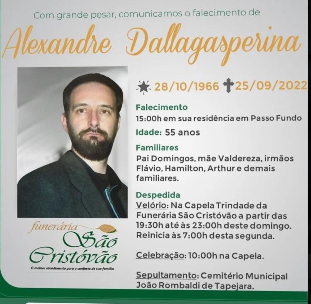 A Funerária São Cristóvão, juntamente com a família Dalagasperina, comunica com pesar, o falecimento de Alexandre Dallagasperina, ocorrido às 15:00 horas do dia 25/09 em sua residência em Passo Fundo com 55 anos de idade. Seu corpo está sendo velado na Capela Trindade da Funerária São Cristóvão. Celebração às 10:00 horas do dia 26/09 e após seu sepultamento no Cemitério Municipal João Rombaldi.