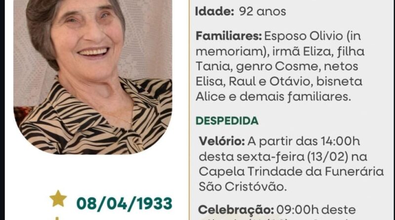 A Funerária São Cristóvão, juntamente coma família Cadore e a família Aita, comunica com pesar, o falecimento de Alice Cadore Aita, ocorrido às 10:00h do dia 13/02/2026 no HSA de Tapejara, com 92 anos de idade. Seu corpo está sendo velado a partir das 14:00hdo dia 13/02/2026 na Capela Trindade da Funerária São Cristóvão. Celebração às 09 horas do dia 14/02/2026 e após seu sepultamento no Cemitério Municipal João Rombaldi.