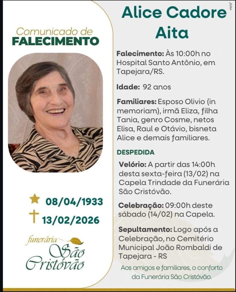 A Funerária São Cristóvão, juntamente coma família Cadore e a família Aita, comunica com pesar, o falecimento de Alice Cadore Aita, ocorrido às 10:00h do dia 13/02/2026 no HSA de Tapejara, com 92 anos de idade. Seu corpo está sendo velado a partir das 14:00hdo dia 13/02/2026 na Capela Trindade da Funerária São Cristóvão. Celebração às 09 horas do dia 14/02/2026 e após seu sepultamento no Cemitério Municipal João Rombaldi.