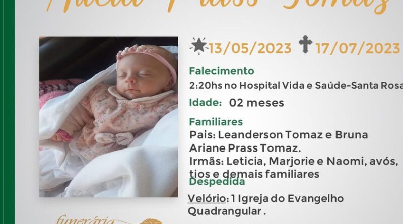 A Funerária São Cristóvão, juntamente com a família Tomaz, comunica com pesar, o falecimento de Alicia Prass Tomaz, filha de Leanderson Tomazz e Bruna Ariane Prass Tomaz, ocorrido às 02h20min do dia 17/07/2023 no Hospital Vida e Saúde de Santa Rosa, com 2 meses de idade. Seu corpo está sendo guardado na Igreja do Evangelho Quadrangular. Culto e sepultamento com horário a definir.