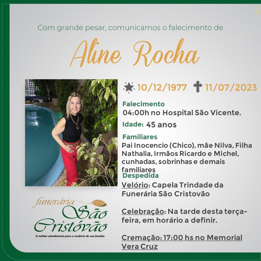 A Funerária São Cristóvão, juntamente com a família Rocha, comunica com pesar, o falecimento de Aline Rocha, ocorrido às 04 horas do dia 11/07/2023 no Hospital São Vicente de Paulo de Passo Fundo com 45 anos de idade. Seu corpo está sendo velado na Capela Trindade da Funerária São Cristóvão. Celebração na tarde desta terça-feira com horário a definir. às 17 horas cremação no Memorial Vera Cruz de Passo Fundo.