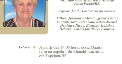 A Funerária São Cristóvão, juntamente com a família Rocha, comunica com pesar, o falecimento de Aline Rocha, ocorrido às 04 horas do dia 11/07/2023 no Hospital São Vicente de Paulo de Passo Fundo com 45 anos de idade. Seu corpo está sendo velado na Capela Trindade da Funerária São Cristóvão. Celebração na tarde desta terça-feira com horário a definir. às 17 horas cremação no Memorial Vera Cruz de Passo Fundo.