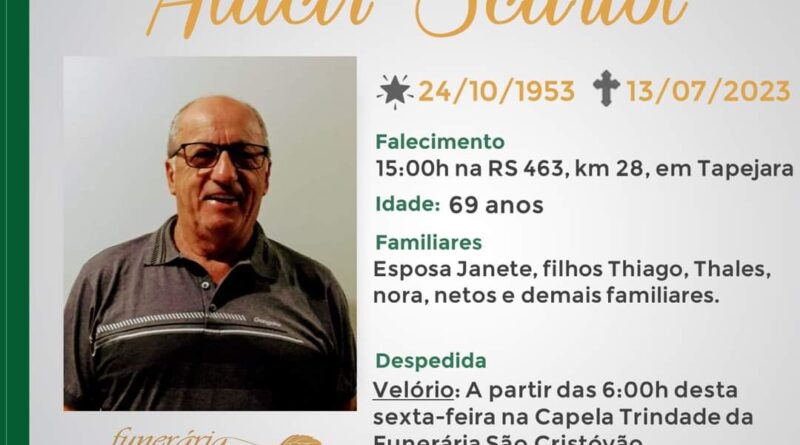 A Funerária São Cristóvão, juntamente com a família Scariot, comunica com pesar, o falecimento de Altair Scariot, ocorrido às 15 horas do dia 13/07/2023 na ERS 463 com 67 anos de idade. Seu corpo será velado na Capela Trindade da Funerária São Cristóvão a partir das 06 horas do dia 14/07/2023. Celebração às 10 horas e após o corpo será cremado no Memorial da Paz em Passo Fundo.