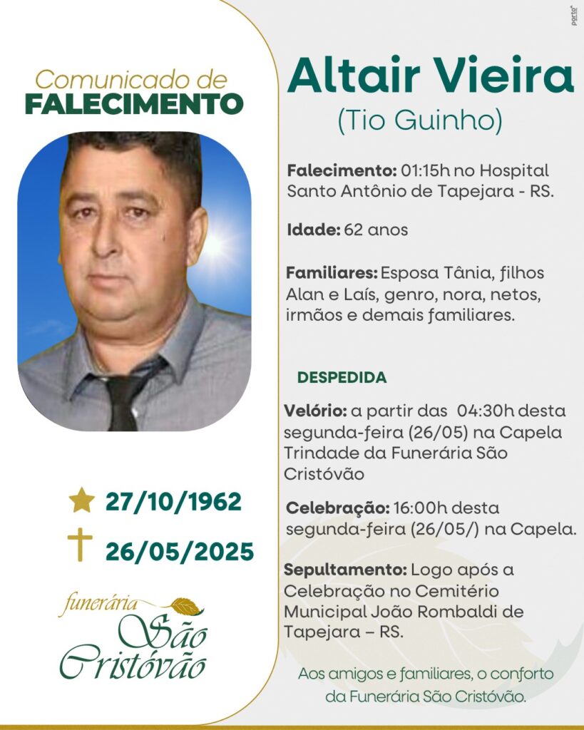 A Funerária São Cristóvão, juntamente com a família Vieira, comunica com pesar, o falecimento de Altair Vieira – Tio Guinho, ocorrido à 01h15 do dia 26/05/2025 no HSA de Tapejara com 62 anos de idade. Seu corpo está sendo velado na Capela Trindade da Funerária São Cristóvão. Celebração às 16 horas do dia 26/05/2025 no e após seu sepultamento no Cemitério Municipal João Rombaldi.