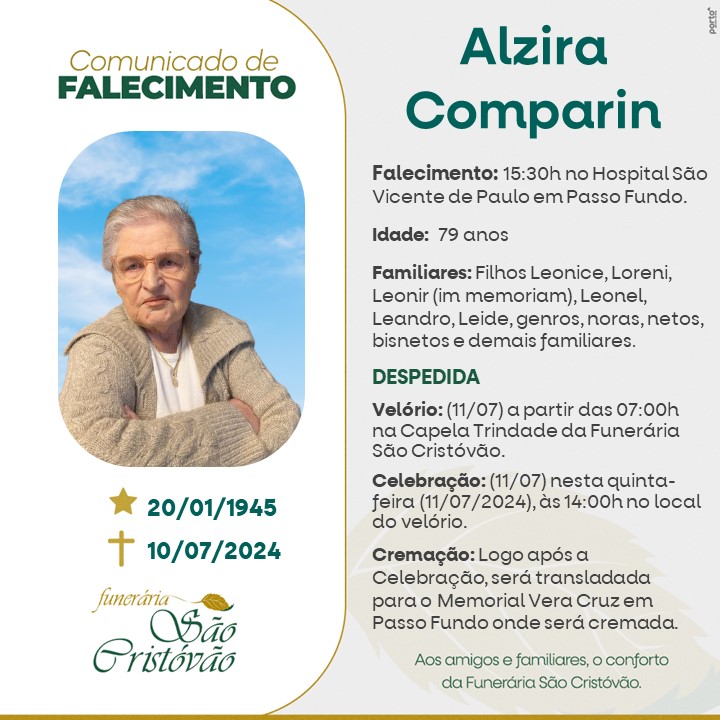 A Funerária São Cristóvão, juntamente com a família Comparin, comunica com pesar, o falecimento de Alzira Comparin, ocorrido às 15h30 do dia 10/07/2024 no Hospital São Vicente de Paulo de Passo Fundo com 79 anos de idade. Seu corpo será velado a partir das 07 horas do dia 11/07/2024 na Capela Trindade da Funerária São Cristóvão. Celebração às 14 horas no local do velório e após seu corpo será transladado para o Memorial Vera Cruz em Passo Fundo onde será cremado.