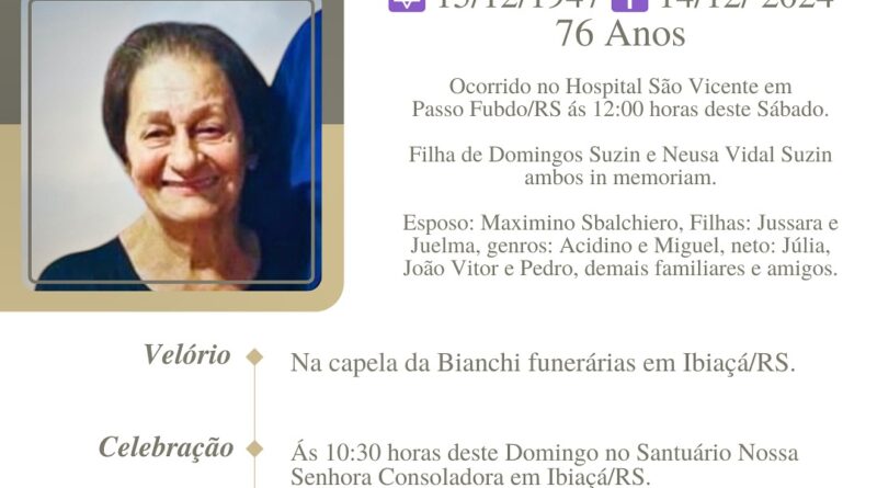 A Bianchi Funerárias, juntamente com a família Sbalchiero, comunica com pesar, o falecimento de Amabile Alexandrina Sbalchiero – “Dedi”, ocorrido às 12 horas do dia 14/12/2024 no Hospital São Vicente de Paulo de Passo Fundo com 76 anos de idade. Seu corpo está sendo velado na Capela Bianchi de Ibiaçá. Celebração às 10h30 do dia 15/12/2024 no Santuário Nossa Senhora Consoladora e após seu sepultamento no Cemitério Municipal de Ibiaçá.