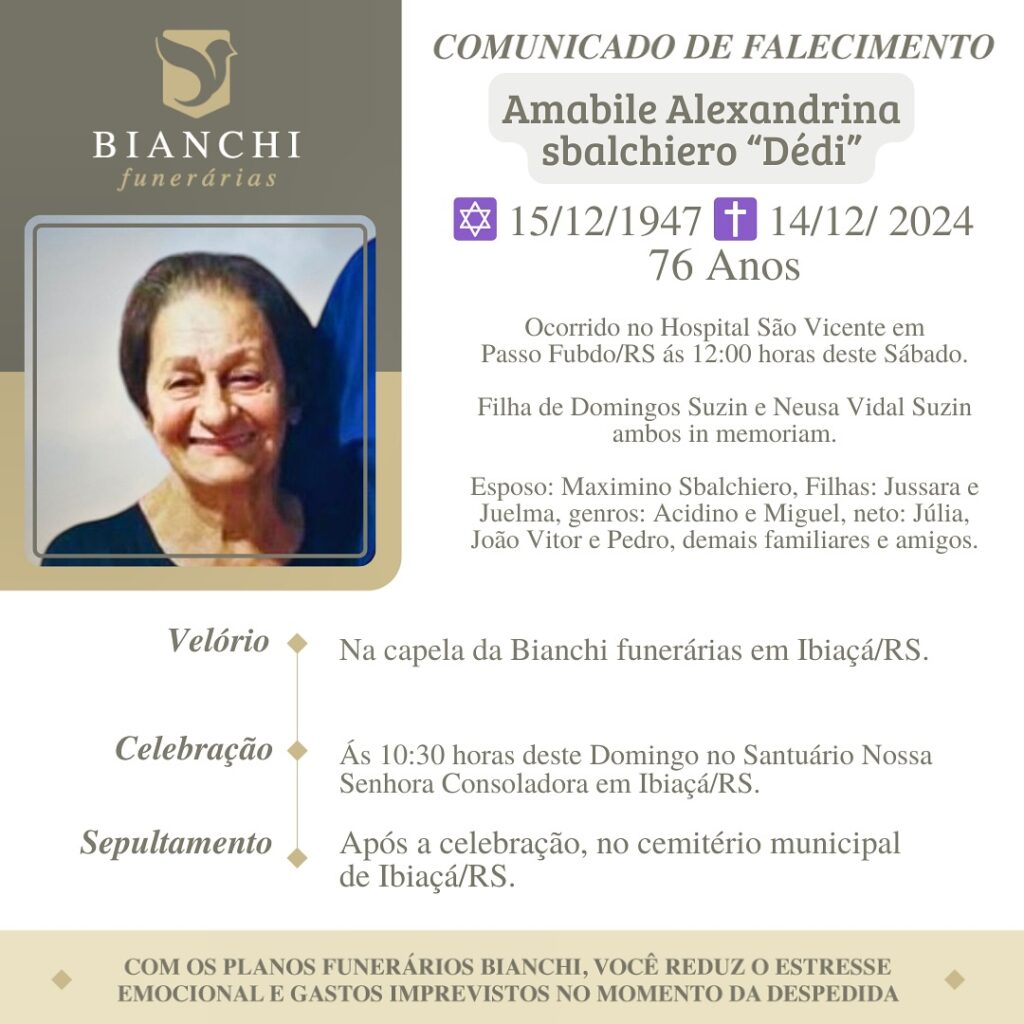 A Bianchi Funerárias, juntamente com a família Sbalchiero, comunica com pesar, o falecimento de Amabile Alexandrina Sbalchiero – “Dedi”, ocorrido às 12 horas do dia 14/12/2024 no Hospital São Vicente de Paulo de Passo Fundo com 76 anos de idade. Seu corpo está sendo velado na Capela Bianchi de Ibiaçá. Celebração às 10h30 do dia 15/12/2024 no Santuário Nossa Senhora Consoladora e após seu sepultamento no Cemitério Municipal de Ibiaçá.