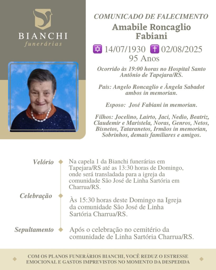 A Bianchi Funerárias, juntamente com a família Fabiani, comunica com pesar, o falecimento de Amábile Roncaglio Fabiani, ocorrido às 19 horas do dia 02/08/2025 no HSA de Tapejara com 95 anos de idade. Seu corpo está sendo velado na Capela 1 da Bianchi Funerárias até às 13h30 do dia 03/08/2025, quando seu corpo será transladado para a Igreja da Comunidade de Linha Sartória – Charrua. Celebração às 15h30 deo dia 03/08/2025 e após seu sepultamento no Cemitério da mesma comunidade.