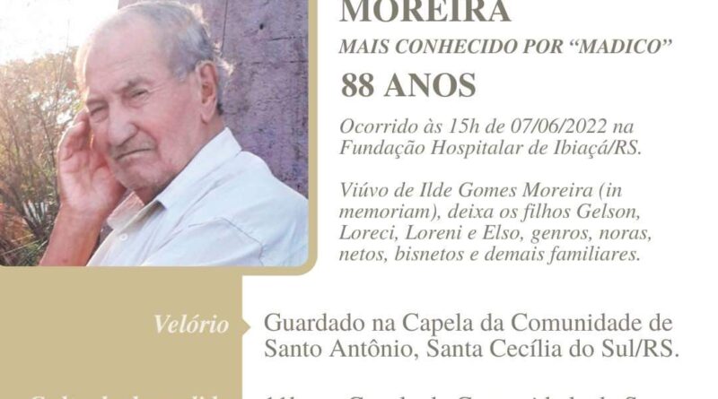 A Bianchi Funerárias, juntamente com a família Moreira, comunica com pesar, o falecimento de AMADEU ANTUNES MOREIRA, com 88 anos de idade, ocorrido em 07/06/2022, na Fundação Hospitalar de Ibiaçá/RS. Seu corpo está sendo guardado na Capela de santo Antônio – Santa Cecília do Sul. Culto de despedida, às 11:00 horas de quarta-feira (08/06) e após seu sepultamento no cemitério da mesma localidade.