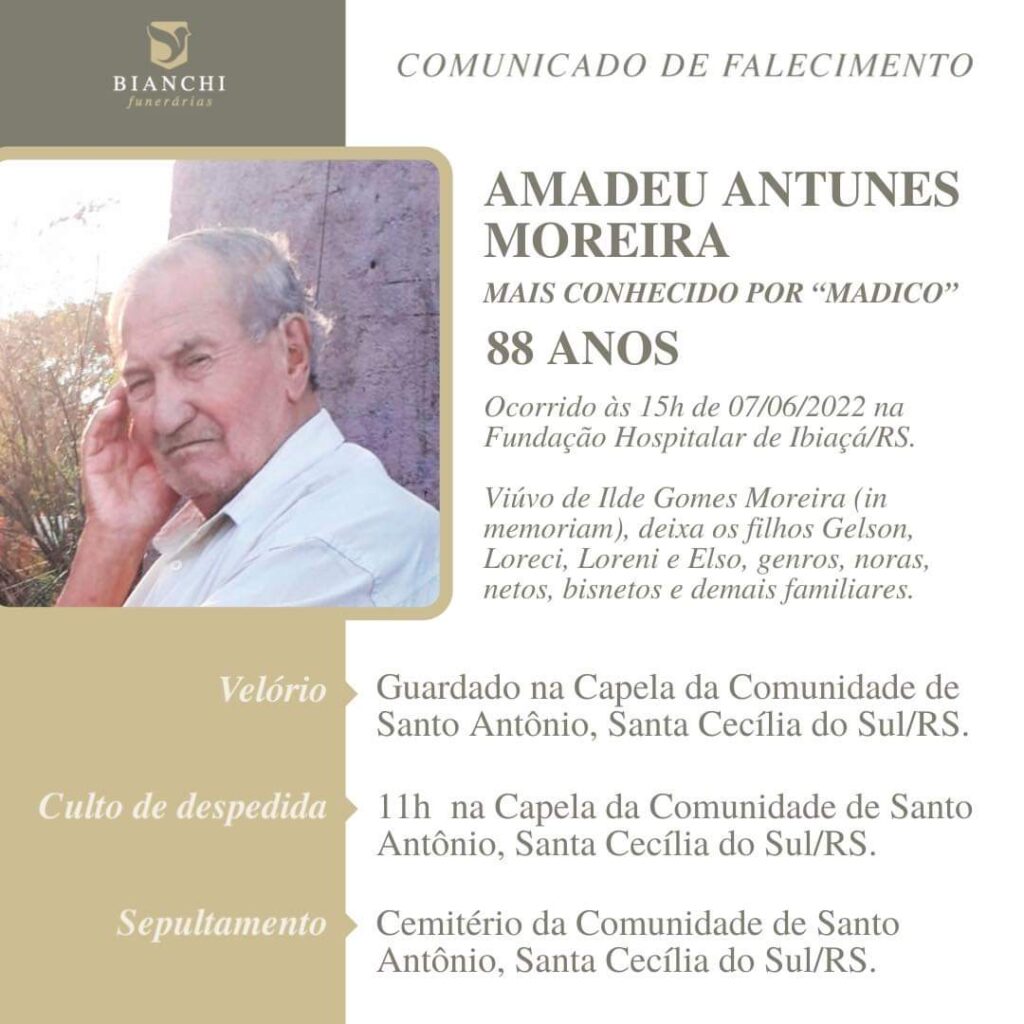A Bianchi Funerárias, juntamente com a família Moreira, comunica com pesar, o falecimento de AMADEU ANTUNES MOREIRA, com 88 anos de idade, ocorrido em 07/06/2022, na Fundação Hospitalar de Ibiaçá/RS. Seu corpo está sendo guardado na Capela de santo Antônio – Santa Cecília do Sul. Culto de despedida, às 11:00 horas de quarta-feira (08/06) e após seu sepultamento no cemitério da mesma localidade.