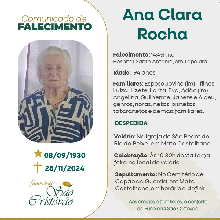 A Funerária São Cristóvão, juntamente com a família Rocha, comunica com pesar, o falecimento de Ana Clara Rocha, ocorrido às 14h45 do dia 25/11/2024 no HSA de Tapejara com 94 anos de idade. Seu corpo está sendo velado na Igreja de São Pedro do Rio do Peixe, em Mato Castelhano. Celebração às 10h30 do dia 26/11/2024 no local do velório e seu sepultamento no Cemitério de Capão da Guarda, Mato Castelhano em horário a ser definido.