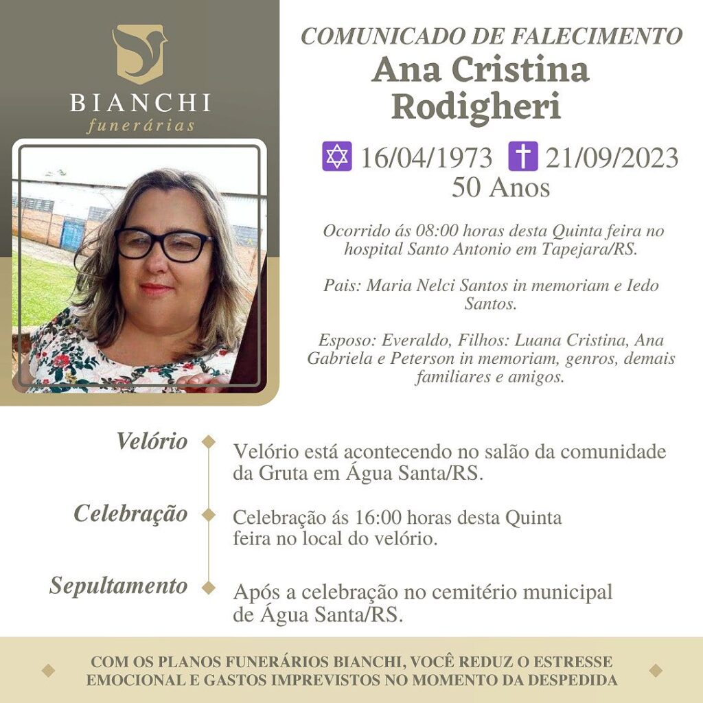 A Bianchi Funerárias, juntamente com a família Rodigueri, comunica com pesar, o falecimento de Ana Cristina Rodigueri, ocorrido às 08 horas do dia 21/09/2023 no HSA com 50 anos de idade. Seu corpo está sendo velado no Salão da Comunidade da Gruta em Água Santa. Celebração às 16 horas do dia 21/09/2023 e após seu sepultamento no Cemitério Municipal de Água Santa.