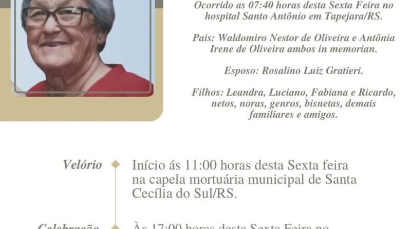 A Bianchi Funerárias juntamente com a família Oliveira e a família Gratieri, comunica com pesar, o falecimento de Ana de Oliveira Gratieri, ocorrido às 07:40horas do dia 13/02/2026 no HSA de Tapejara com 79 anos de idade. Seu corpo está sendo velado na Capela Mortuária Municipal de Santa Cecília RS. Celebração às 17 horas do dia 13/02/2026 no local do velório e após seu sepultamento no Cemitério Municipal João Guerra de Santa Cecília do Sul RS.