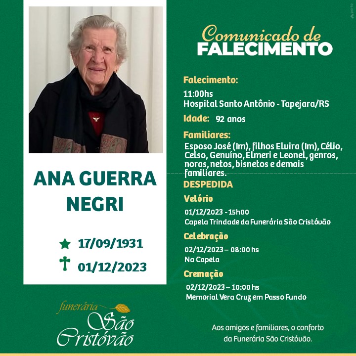 A Funerária São Cristóvão, juntamente com a família Negri, comunica com pesar, o falecimento de Ana Guerra Negri, ocorrido às 11 horas do dia 01/12/2023 no HSA com 92 anos de idade. Seu corpo está sendo velado na Capela Trindade da Funerária São Cristóvão. Celebração às 08 horas do dia 02/12/2023 no local do velório e após seu corpo será transladado para o Memorial da Paz Vera Cruz em Passo Fundo onde será cremada.