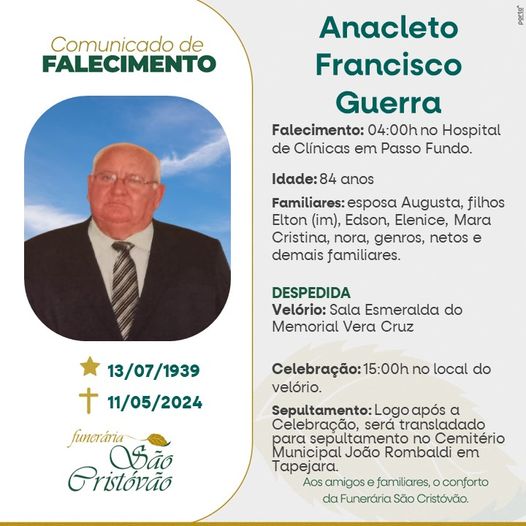 A Funerária São Cristóvão, juntamente com a família Guerra, comunica com pesar, o falecimento de Anacleto Francisco Guerra, ocorrido às 05 horas do dia 11/05/2024 no HSA de Tapejara com 84 anos de idade. Seu corpo está sendo velado na sala Esmeralda do Memorial Vera Cruz em Passo Fundo. Celebração às 15 horas no local do velório, e após seu corpo será transladado até o Cemitério Municipal João Rombaldi de Tapejara onde será seu sepultamento.