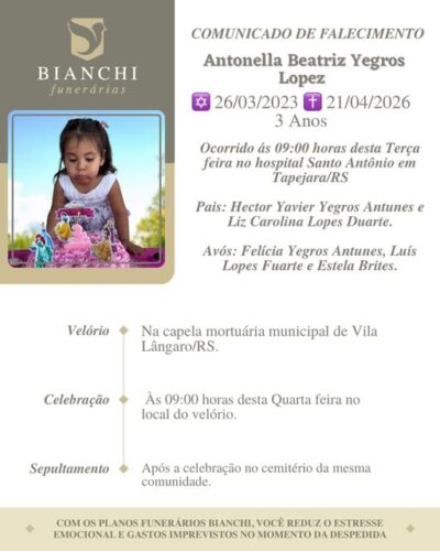 A Bianchi Funerárias juntamente com a família Lopez, comunica com pesar, o falecimento de Antonella Beatriz Yegros Lopez, ocorrido às 09 horas do dia 21/04/2026 no HSA de Tapejara com 3 anos de idade. Seu corpo está sendo velado na Capela Mortuária de Vila Lângaro. Celebração às 09 horas do dia 22/04/2026 no local do velório e após seu sepultamento no Cemitério da mesma localidade.