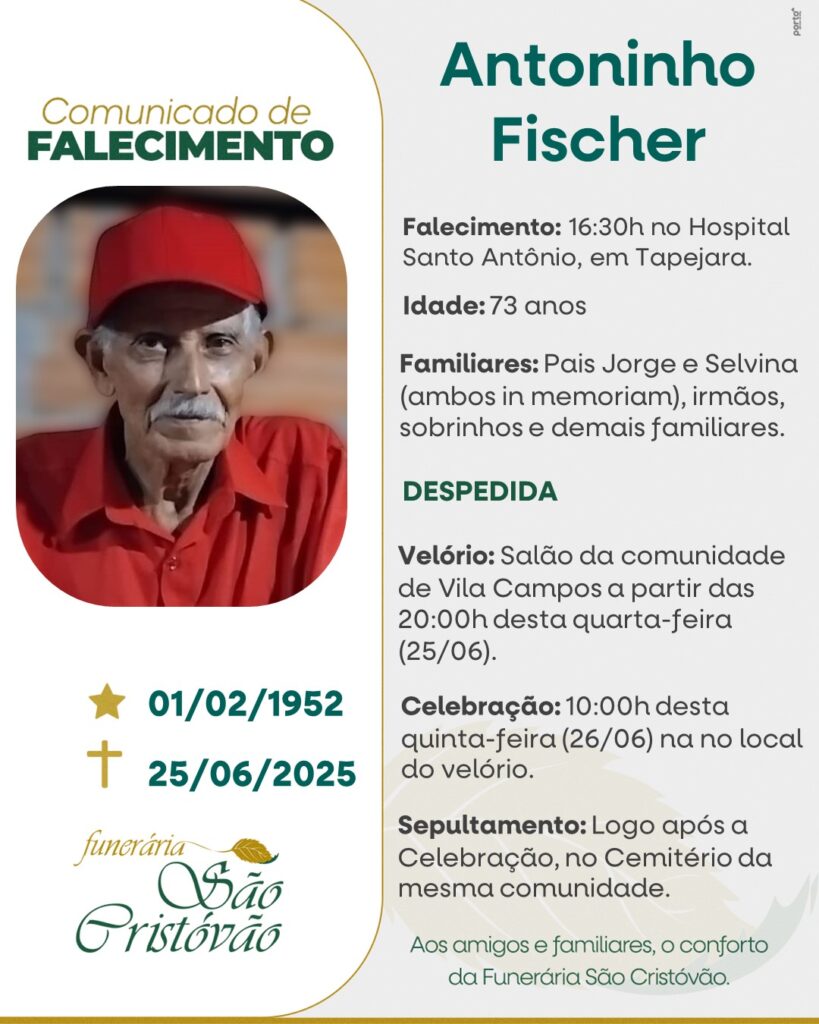 A Funerária São Cristóvão, juntamente com a família Fischer, comunica com pesar, o falecimento de Antoninho Fischer, ocorrido às 16h30 do dia 25/06/2025 no HSA de Tapejara com 73 anos de idade. Seu corpo está sendo velado no Salão Da Comunidade de Vila Campos. Celebração às 10 horas do dia 26/06/2025 e após sepultamento no Cemitério da mesma Comunidade.