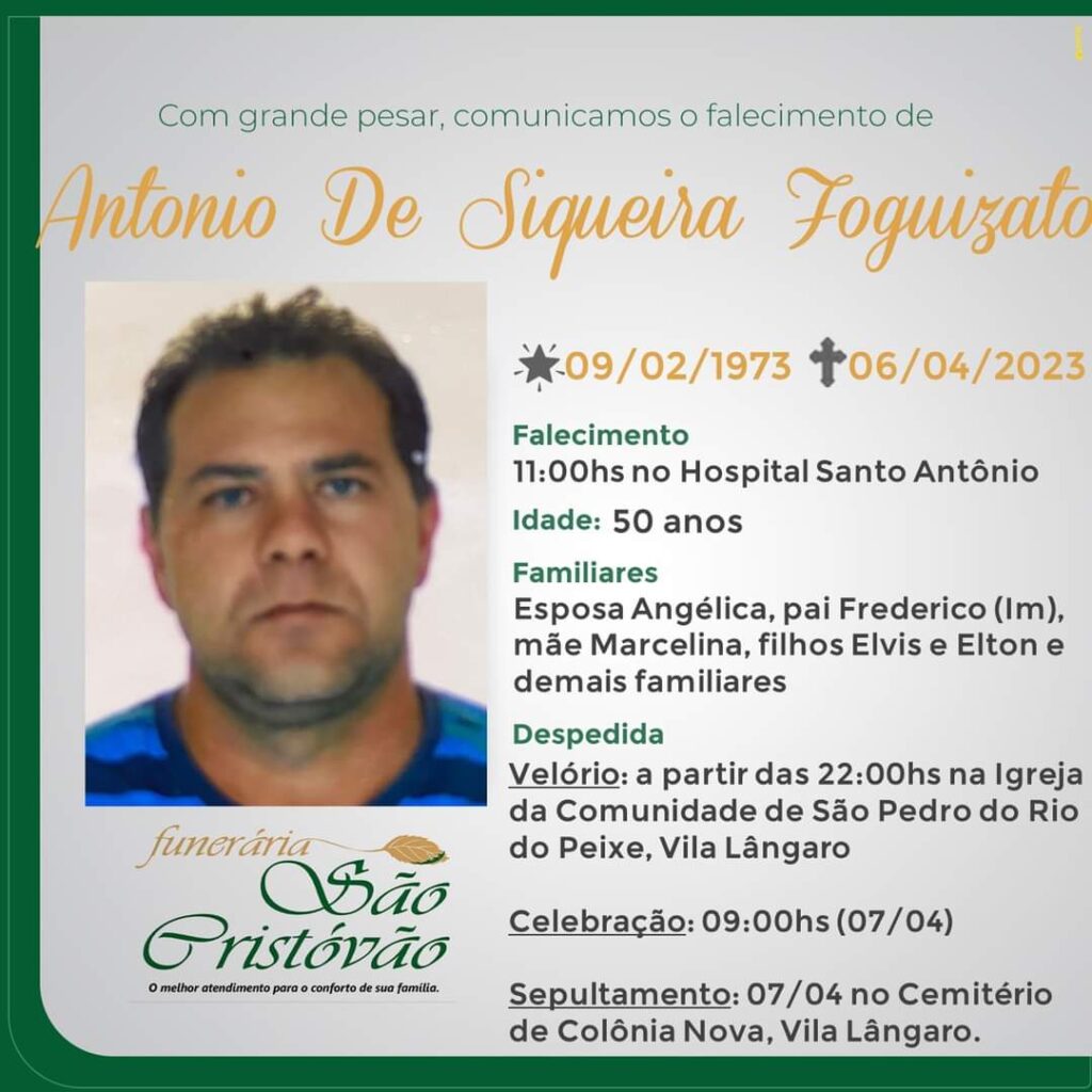 A Funerária São Cristóvão, juntamente com a família Foguizato, comunica com pesar, o falecimento de Antônio de Oliveira Foguizato, ocorrido às 11 horas do dia 06/04/2023 no HSA com 50 anos de idade. Seu corpo será velado a partir das 22 horas na Igreja da Cominidade de Rio Do Peixe – Vila Lângaro. Celebração às 09 horas do dia 07/04/2023 e após seu sepultamento no Cemitério de Colônia Nova – Vila Lângaro.