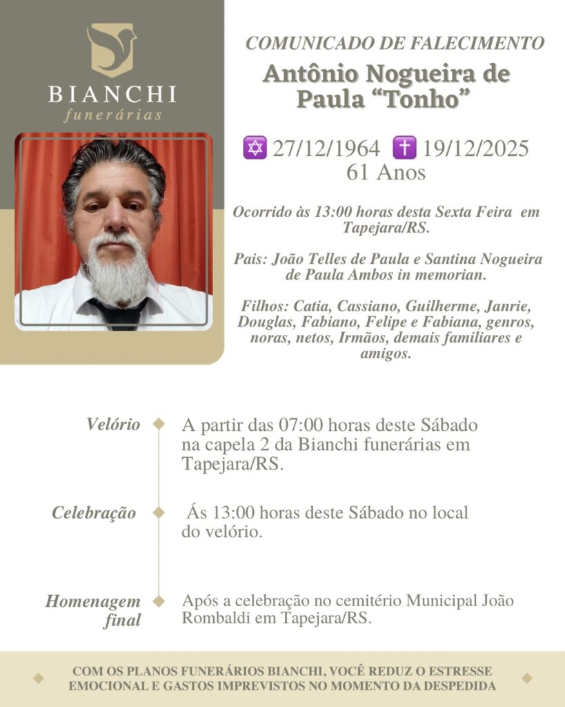 A Bianchi Funerárias, juntamente com a família de Paula, comunica com pesar, o falecimento de Antônio Nogueira de Paula – “Tonho” , ocorrido às 13 horas do dia 19/12/2025 em Tapejara com 61 anos de idade. Seu corpo será velado a partir das 07 hora do dia 20/12/2025 na Capela 2 da Bianchi Funerárias. Celebração às 13 horas do dia 20/12/2025 e após seu sepultamento no Cemitério Municipal João Rombaldi.