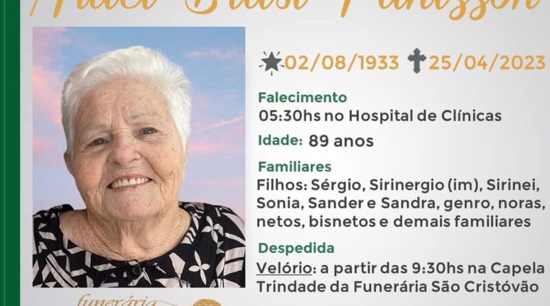 A Funerária São Cristóvão, juntamente com a família Panizzon, comunica com pesar, o falecimento de Araci Biasi Panizzon,ocorrido às 05:30 horas do dia 25/03/2023 no Hospital de Clínicas de Passo Fundo com 89 anos de idade. Seu corpo está sendo velado na Capela Trindade da Funerária São Cristóvão. Celebração às 16:00 horas e após seu sepultamento no Cemitério Municipal João Rombaldi.