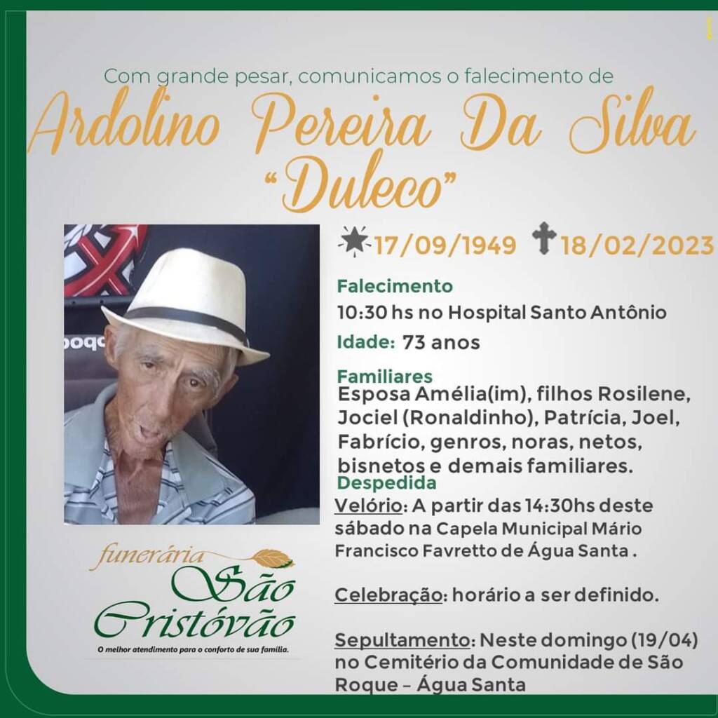 A Funerária São Cristóvão, juntamente com a família da Silva, comunica com pesar, o falecimento de Ardolino Pereira da Silva -” Duleco”, ocorrido às 10:30 horas do dia 18/02/2023 no HSA com 73 anos de idade. Seu corpo será velado na Capela Mortuária de Água Santa a partir das 14:30 horas. Celebração e sepultamento dia 19/02/2023 com horário a ser definido.
