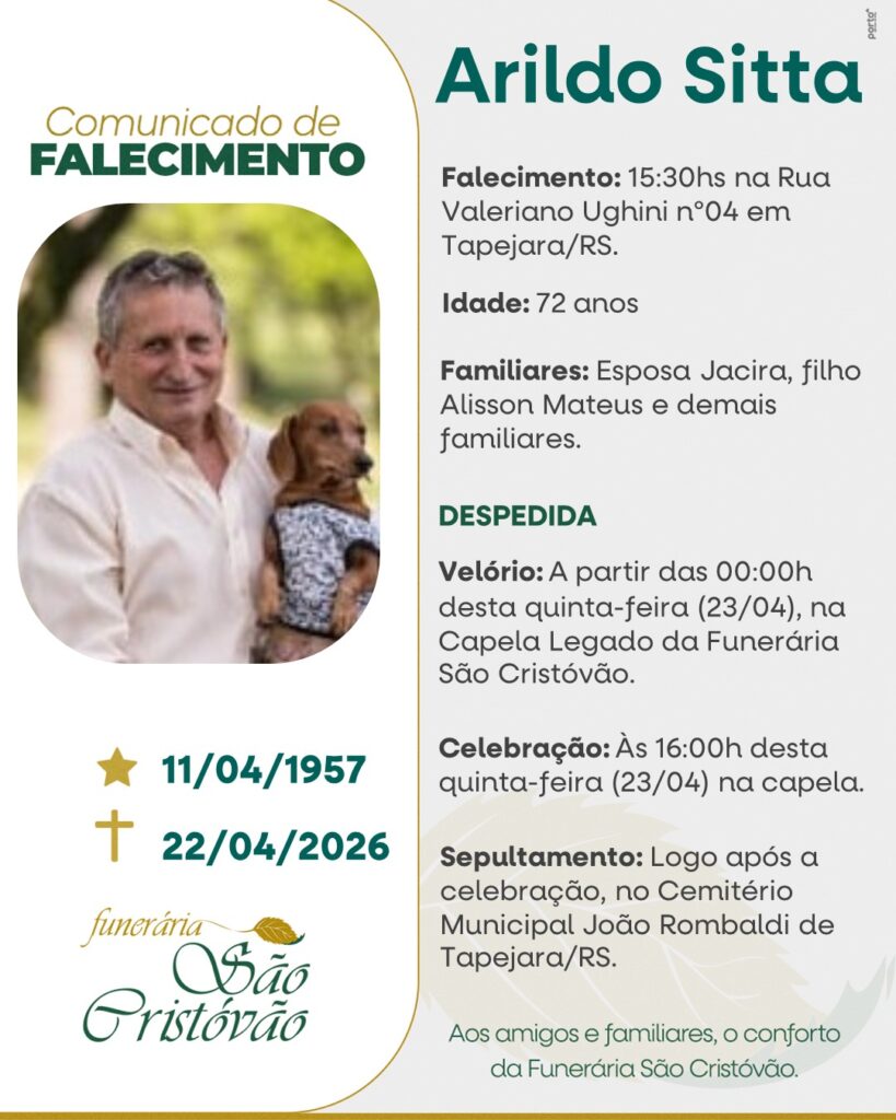 A Funerária São Cristóvão, juntamente com a família Sitta, comunica com pesar, o falecimento de Arildo Sitta, ocorrido às 15h30 do dia 22/04/2026 na Rua Valeriano Ughini, nº 4 em Tapejara com 72 anos de idade. Seu corpo está sendo velado na Capela Legado da Funerária São Cristóvão. Celebração às 16 horas do dia 23/04/2026 e após seu sepultamento no Cemitério Municipal João Rombaldi de Tapejara.